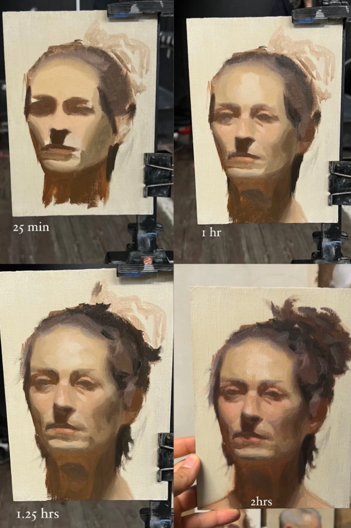 Focus on big, broken planes. Build up detail while keeping anatomy, color, shadow shapes, and lost-and-found edges in mind.